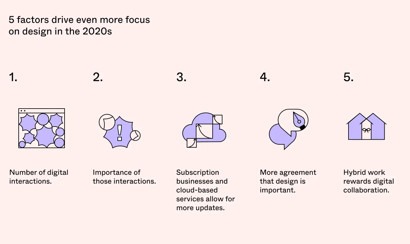 Không chỉ là số lượng tương tác mà còn là tầm quan trọng của chúng. Những tương tác này quyết định cách chúng ta quản lý tài chính , tổ chức và hoàn thành công việc, trị liệu, xem chương trình truyền hình và phim, tìm sách mới và thậm chí lập kế hoạch cuối đời. Nhưng trong khi sự gia tăng nhanh chóng thúc đẩy nhu cầu về thiết kế thì tác động của thiết kế lên cách thức hoạt động của các công ty lại mạnh mẽ hơn.